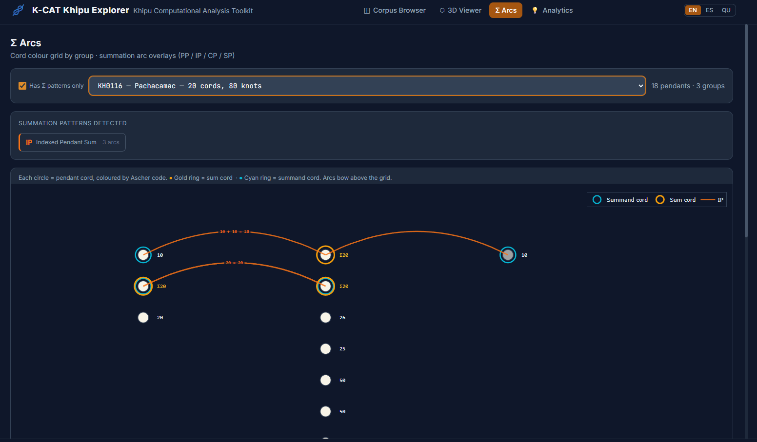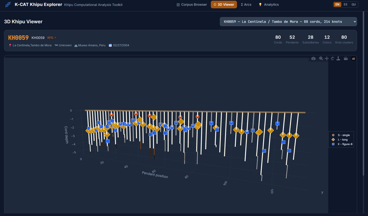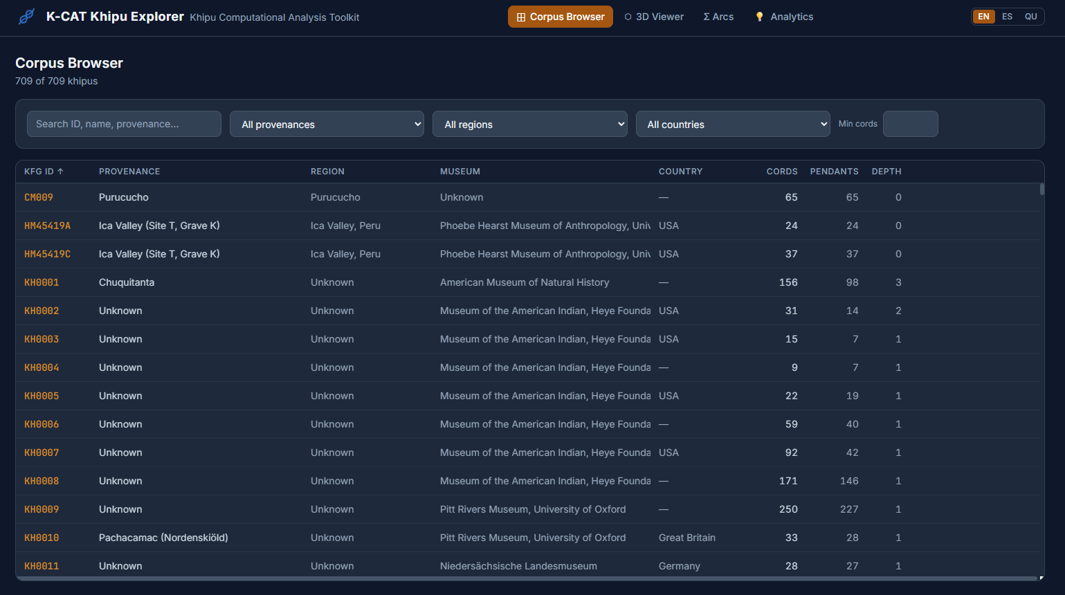 All of this feeds into an interactive local browser that makes the corpus explorable without requiring any programming. A filterable table gives access to all 709 KFG khipus with provenance, region, museum, and cord-count information, with direct links to each khipu's page on the Khipu Field Guide website. A 3D viewer renders the full cord hierarchy for any selected khipu, colored by Ascher color codes, with hover tooltips showing cord name, color, decoded value, and knot data. A Summation Arcs view presents every pendant cord as a colored grid organized by group and position, with a summary table of group-level statistics.